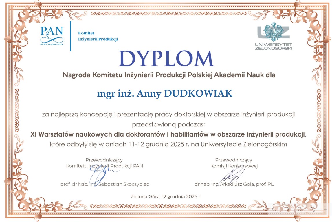 Komitet Inżynierii Produkcji PAN z ogromną radością informuje, że podczas XI Warsztatów naukowych dla doktorantów i habilitantów w obszarze inżynierii produkcji, które odbyły się w dniach 11-12 grudnia 2025 na Uniwersytecie Zielonogórskim po raz pierwszy przyznano 📢 Nagrodę Komitetu Inżynierii Produkcji Polskiej Akademii Nauk za najlepszą koncepcję i prezentację pracy doktorskiej w obszarze inżynierii produkcji!